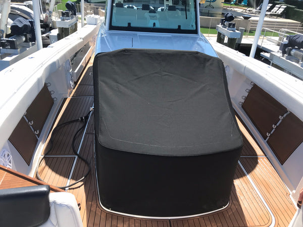 Protective cover designed to fit over the console area of a boat. Shields the console and protects the instruments from elements like sun, rain, and potential damage.
